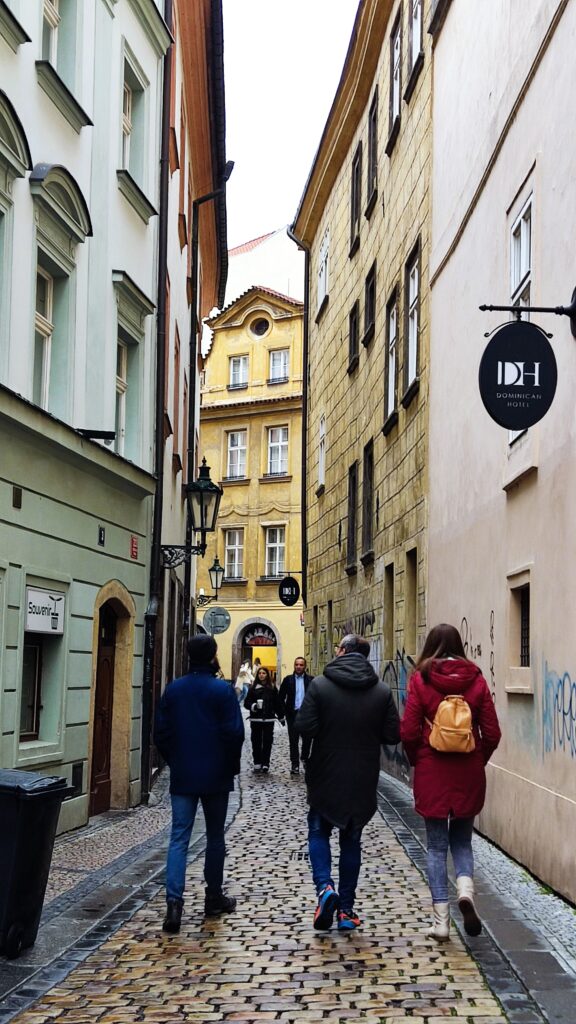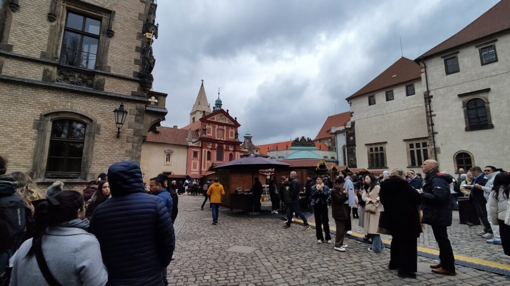 Somos conscientes de que la Praga idílica que estuvimos descubriendo en blogs y fotografías no es la que nos vamos a encontrar, viajamos en Semana Santa. Praga es un destino bastante turístico, y sí que nos vamos a encontrar a mucha gente como nosotros que está de vacaciones esos días y que vamos a tener que soportar colas y mucha gente en los lugares más icónicos de la ciudad como El puente Carlos o la plaza de la ciudad Vieja. Para luchar contra eso lo mejor que se puede hacer es intentar ir contra corriente, madrugar mucho e intentar llegar lo antes posible a sitios que queríamos visitar. El castillo, por ejemplo, abre a las 7:00 y todo lo interesante que hay para ver abre a partir de las 9:00, pero nada te impide llegar a las 8:00 para pasar por el callejón de oro, con suerte eres de los primeros y puedes disfrutar de ese callejón tu solito y sentir la presencia de Kafka llegando a su puerta…