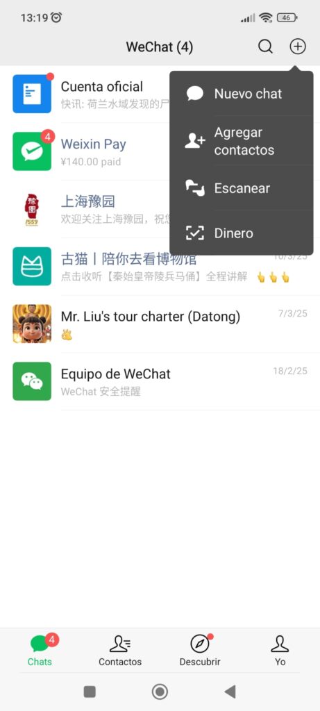WeChat es muy interesante para comunicarte con, por ejemplo, taxistas o guias, ya que si añades el contacto, en el propio chat incluye una función de traducción, así que puedes leer lo que esa persona escribe en chino y él lo que tú escribes en español.