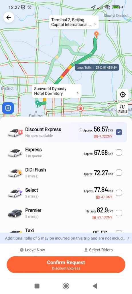 Por ejemplo: Si aterrizas en cualquiera de los aeropuertos de Beijing, la manera de llegar al centro es usar los trenes express de cada uno de los dos aeropuertos principales. Daixing Airport Express cuesta 35 yuanes por persona y Capital Airport Express cuesta 25 yuanes por persona. Si sois dos o más, el precio de un Didi será muy aproximado a lo que os cuestan estos trenes que, por otra parte, no te dejarán directamente en tu destino y posiblemente tengas que añadir un viaje en metro adicional.