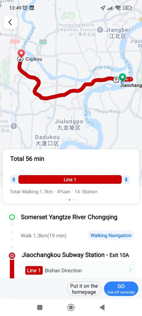 En China, casi todo el mundo usa Gaode Maps, que te traza rutas a pie, en coche o en metro con gran precisión y detalle. Si viajas en metro, por ejemplo, te dice qué lineas coger, qué dirección tomar, cuántas estaciones tienes, dónde hacer transbordos y qué salida (o entrada) de la estación coger. Además, te vibra el móvil cuando estás a punto de llegar a tu estación de destino o transbordo, para que no se te pase.