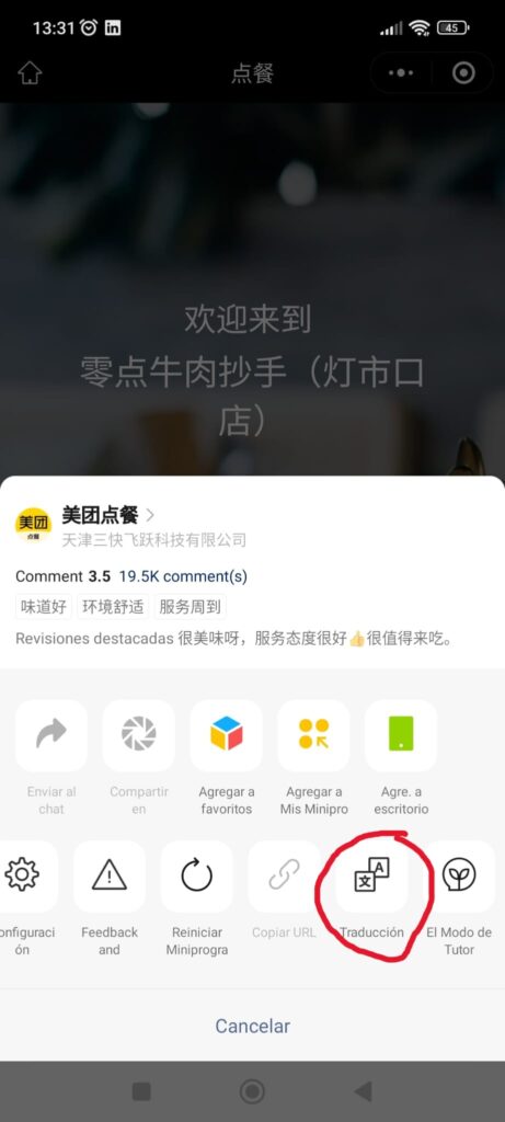 Imagina que entras en un restaurante y tienen un QR en la mesa. Si lo escaneas con WeChat, accederás al menú online, donde puedes seleccionar qué quieres pedir y pagar directamente con tu móvil. Y no te preocupes si te sale todo en chino, porque puedes traducirlo, abriendo el menú en el botón superior y luego usando la opción de «Traducción».