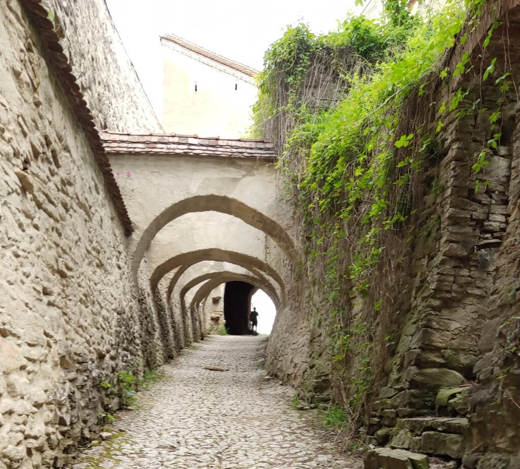 Uno de los rincones más chulos que nos encontramos en Sighişoara fue la Escalera Cubierta o Escalera de los estudiantes, una pasarela de madera con 175 escalones, construida en el siglo XVIII que, en su día permitía a los estudiantes subir protegidos hasta la parte alta de la ciudad, y ahora sigue perfectamente conservada. Y, aunque tienes otros modos, yo te digo que subas los 175 escalones, recorrerla es casi una pequeña aventura que termina en la Iglesia de la Colina
