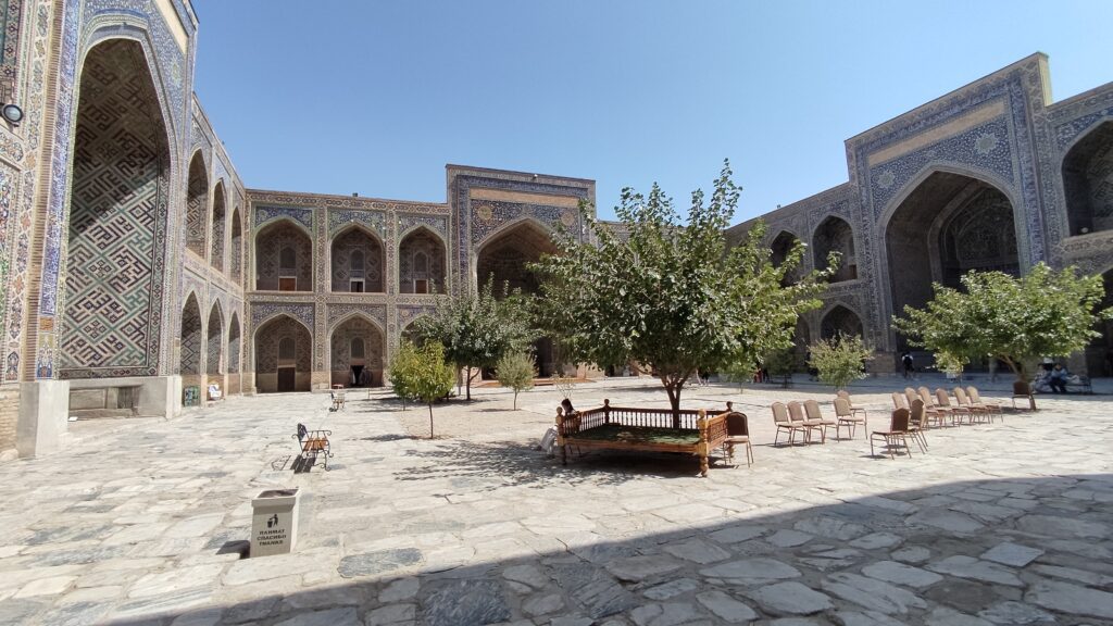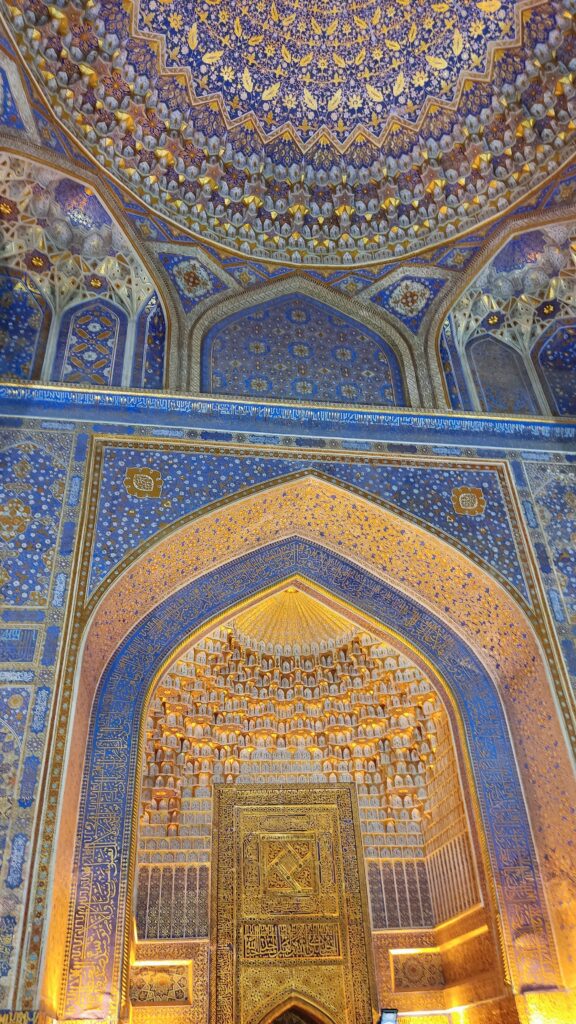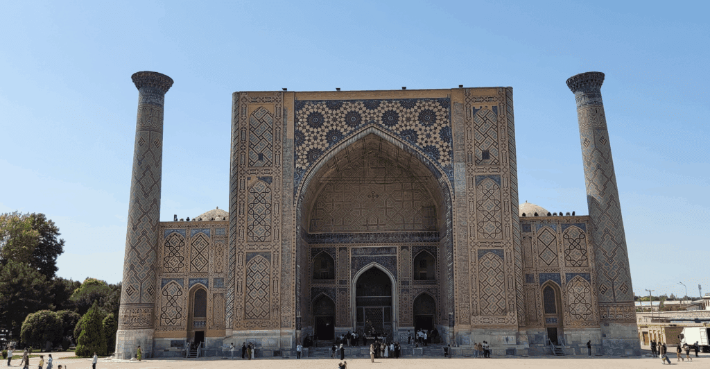La primera que vimos fue la Madrasa de Ulugh Beg. Construida en el siglo XV por Ulugh Beg, nieto de Tamerlán y gran astrónomo, esta madrasa fue una de las instituciones educativas más prestigiosas de Asia Central. Se nota su amor por la ciencia en los intrincados mosaicos de estrellas y formas geométricas que decoran la fachada.