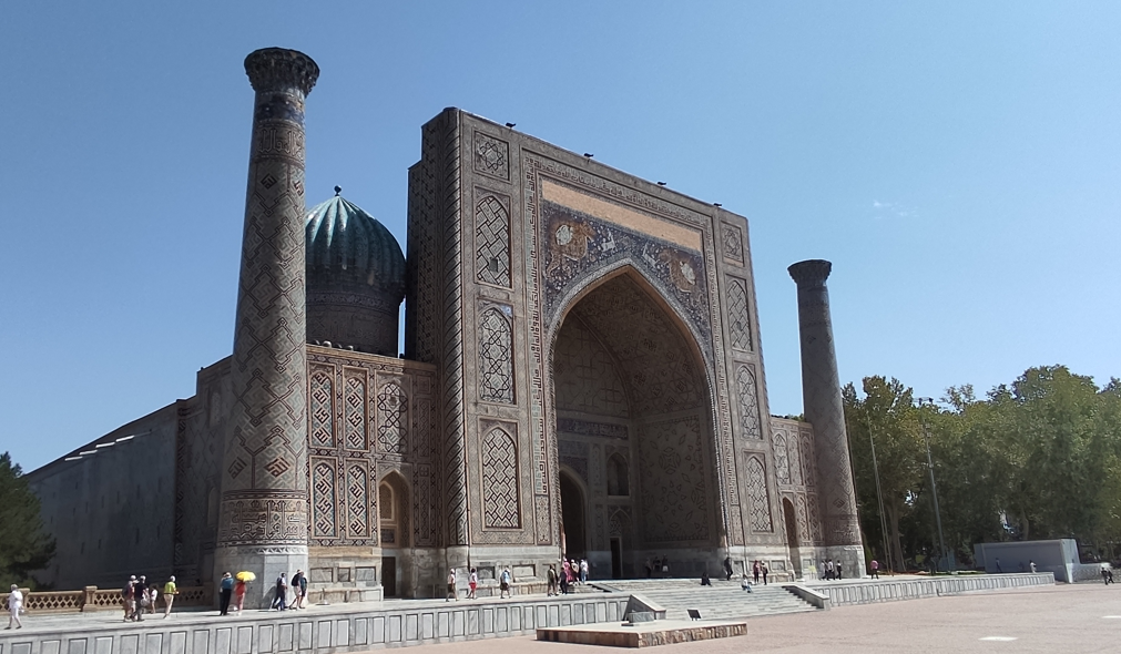 Su portal monumental y los delicados detalles de su fachada hacen de ella una obra maestra que combina arte y ciencia, recordando el legado intelectual de Samarkanda.