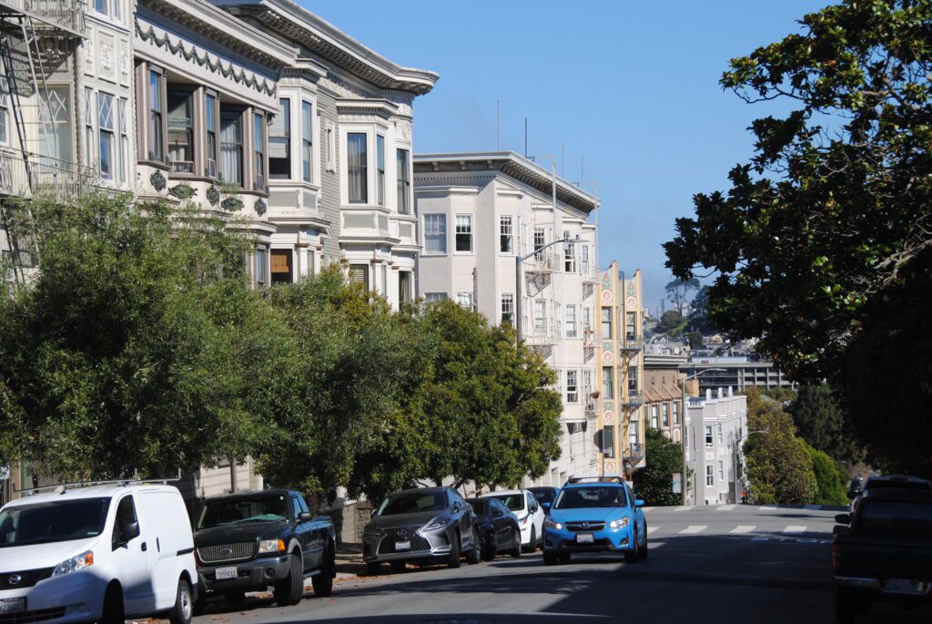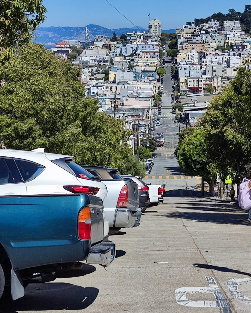 San Francisco es grande, las distancias parecen pequeñas en el mapa, pero cuando te pones a caminar se hacen muy largas, sin contar las subidas o bajadas. Pero merece la pena caminar un poco por ella, San Francisco es una ciudad preciosa, con sus barrios de casas coloniales de colores, los muchos parques que te vas a encontrar a lo largo de ese paseo casi sin fin, y por supuesto los rascacielos del centro, sorprenderte al cruzar una calle y ver la inclinación de la misma y la vista al fondo, la bahía o alguno de los icónicos edificios conocido por haberlo visto en series o películas.