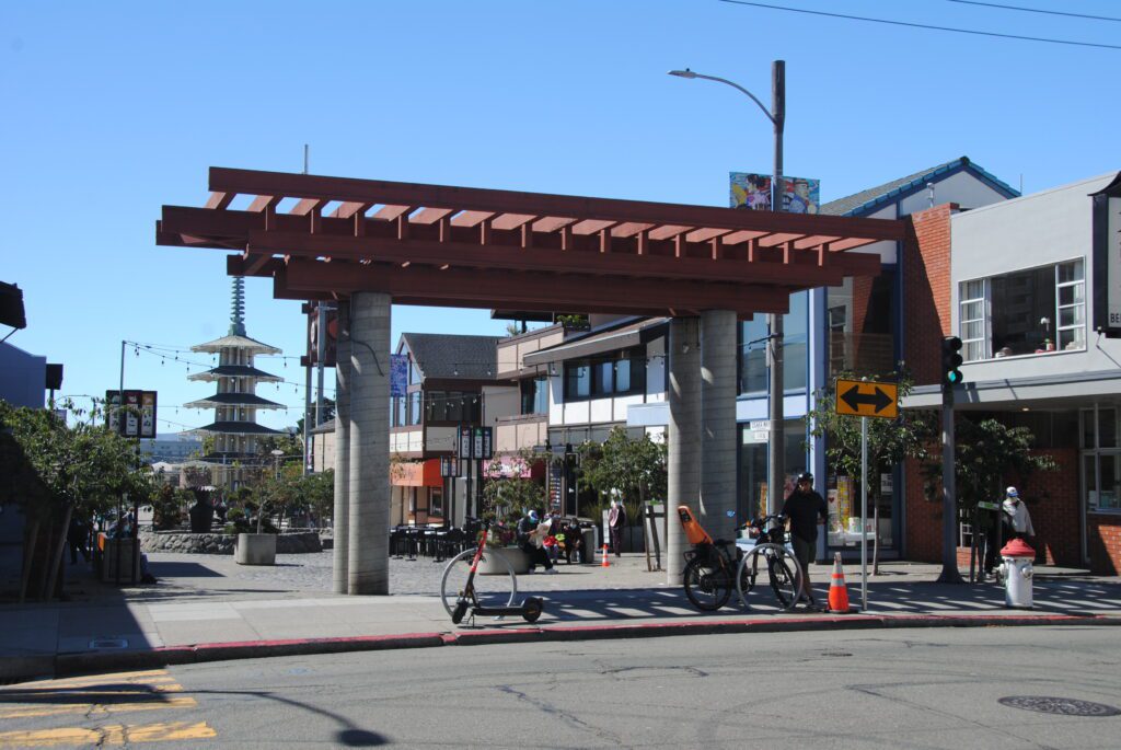 Nuestro siguiente destino era Japantown. Es el barrio japonés más antiguo de Estados Unidos. Nos sorprendió que no había turistas en sus calles. Cuando llegas te recibe una pagoda de 5 pisos, regalo de la ciudad de Osaka, que está en una placita con una fuente y le sigue una callecita con tiendas y cafeterías típicas japonesas. Ocupa varias manzanas, y hay locales de Reflexología, restaurantes de comida japonesa etc.