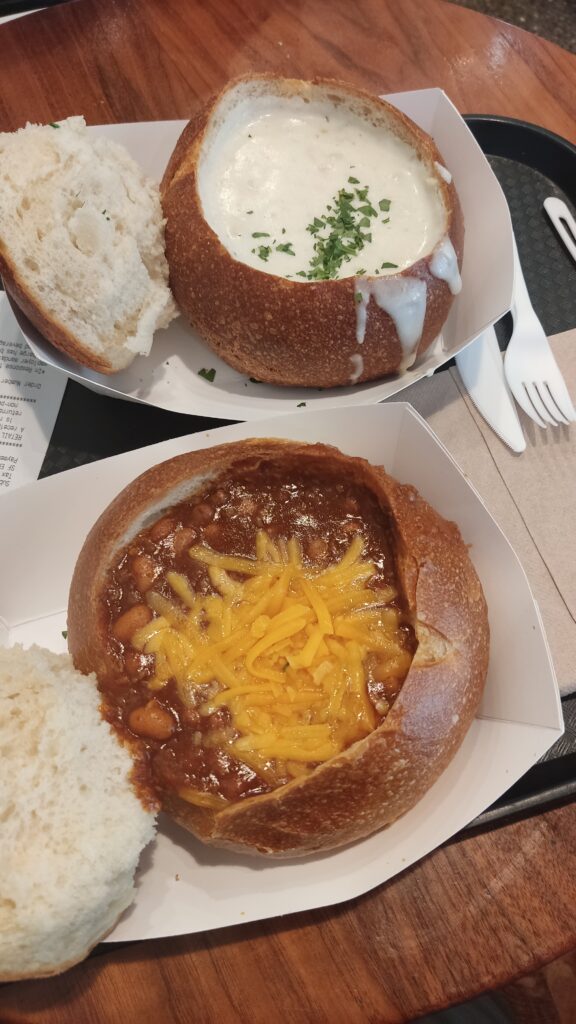 Cuando llegamos al Fisherman´s Wharf fuimos directos a buscar el Boudin Bakery Café, para comer. Pedimos una Clam Chowder (crema de almejas) y otra de Chili con carne, son unas sopas que te ponen en un pan, típico de San Francisco, de masa madre, sacan parte de la miga para poder echar la sopa. Y la verdad es que ambas estaban deliciosas, y el pan riquísimo. Esa mañana no habíamos desayunado casi, y con la caminata que nos habíamos dado teníamos hambre, así que nos comimos casi todo el pan.