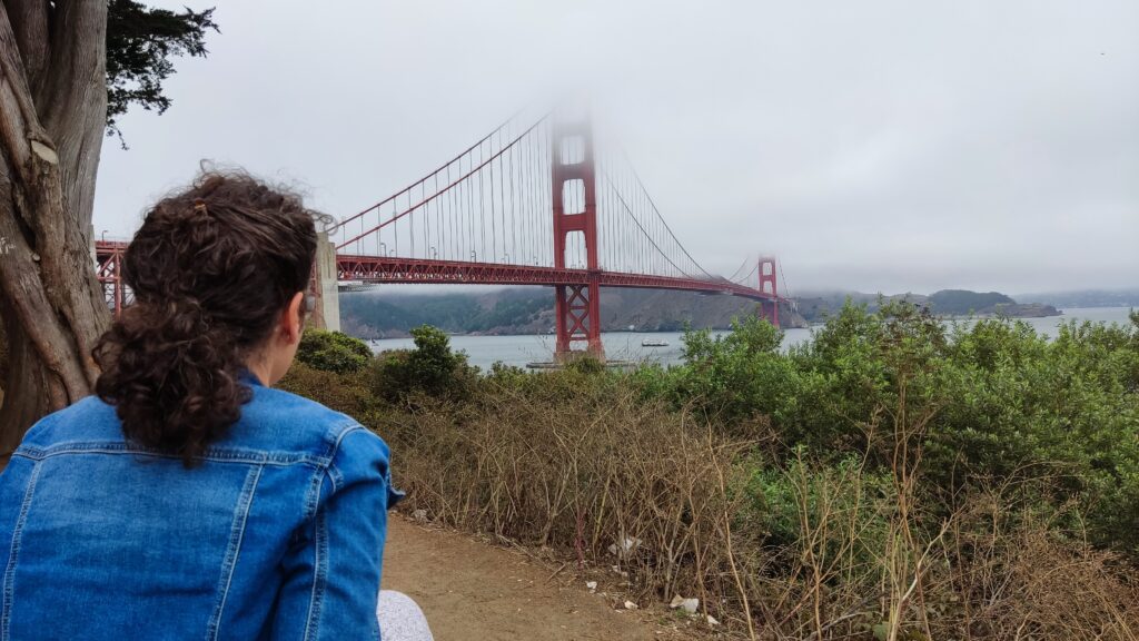 Hoy decidimos ir al Golden Gate. Nuestro viaje fue a finales de agosto, en San Francisco, aunque es verano, hacía fresco, yo de hecho iba todo el día con la cazadora puesta, y por la noche echaba de menos una sudadera más gordita. Leí en algún sitio que no hay invierno tan fresco como los veranos en San Francisco. Os cuento esto porque en los días que estuvimos no conseguimos ver el mítico Golden Gate sin niebla.