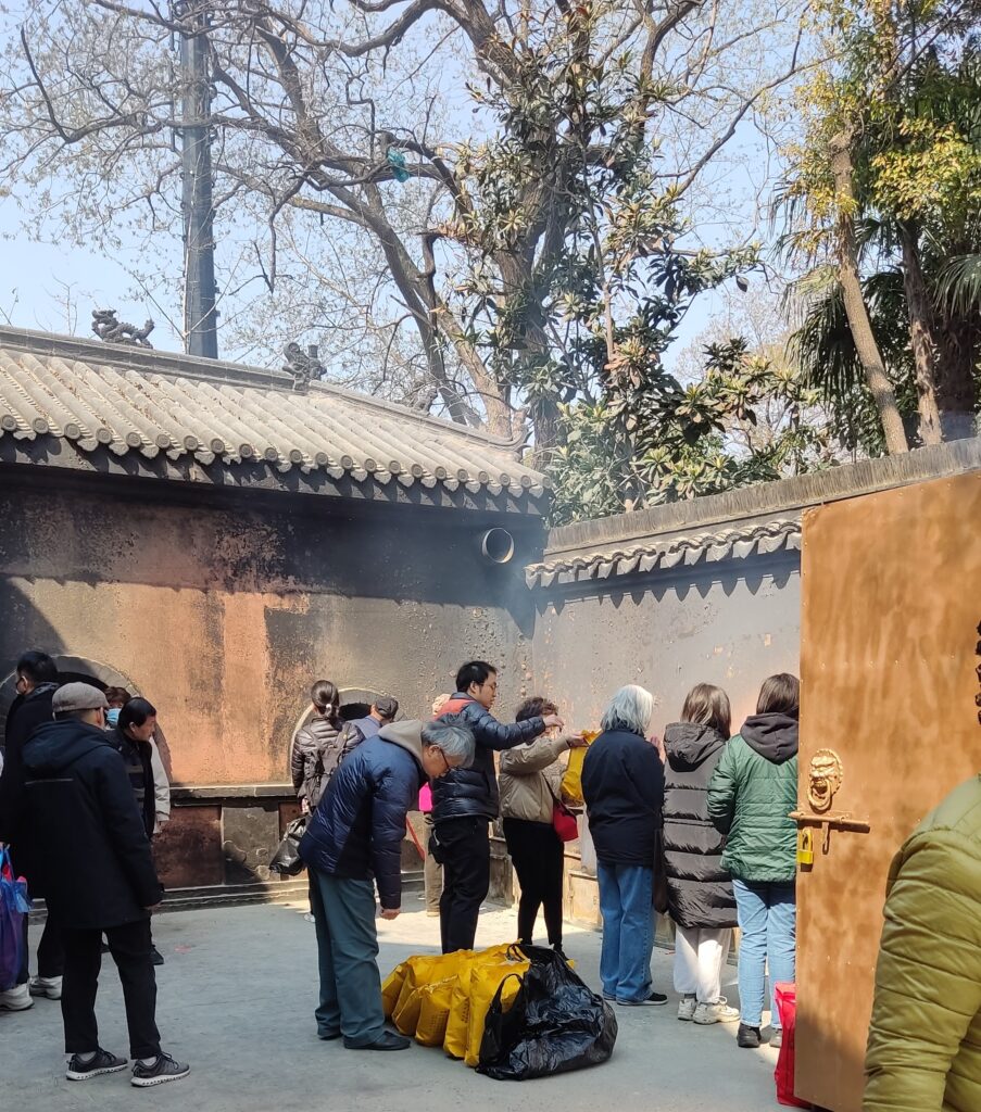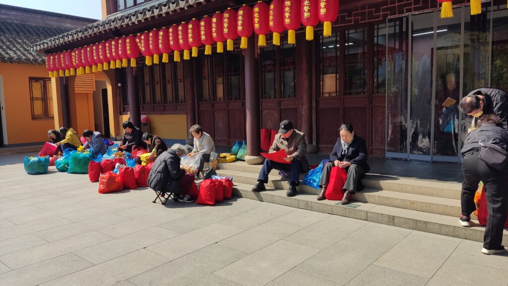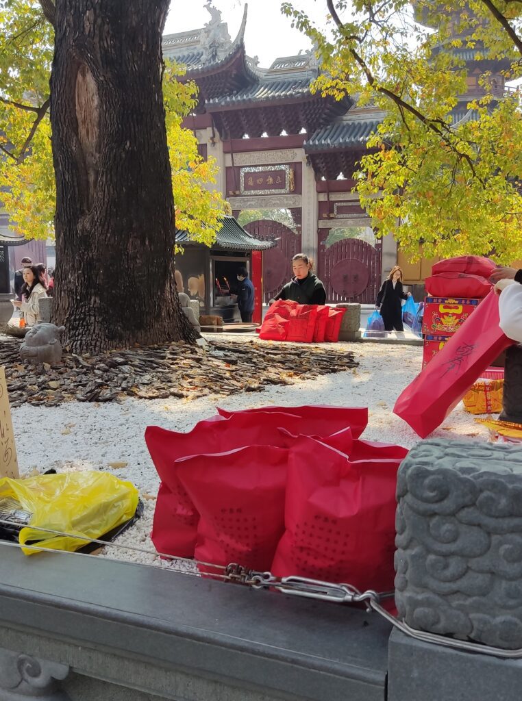 Otra de las cosas que nos sorprendió en la visita de Templo de Longhua, fueron las bolsas rojas que veíamos preparar con toda clase de cositas, sobre todo «dinero del papel» o billetes del Monopoly como decía yo.