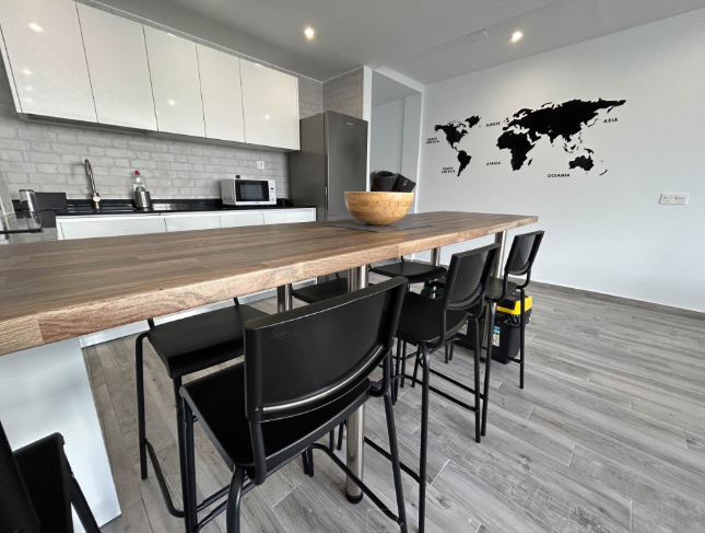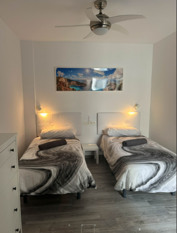 - Planta alta: Salon TV y sala de trabajo, baño, amplia terraza y dos habitaciones privadas (dos camas cada una) con ventanas ventilador de techo y focos de lectura.