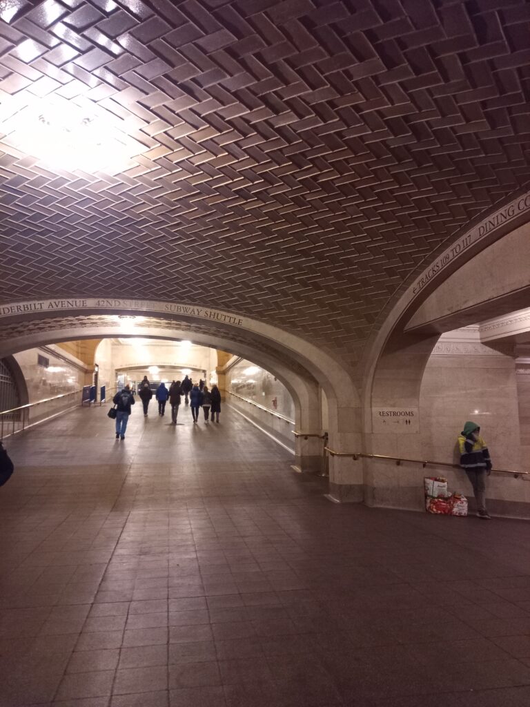 Os cuento una curiosidad de esta estación. En los pasadizos de la segunda planta, hay un cruce de pasillos, como el de la foto. Lo llaman la caverna de los susurros, ¿Sabéis por qué? Si te pones en una esquina y susurras algo en voz baja, la persona que está en la esquina contraria, justo enfrente de ti, oye lo que dices. Sí, a pesar del ruido que hay de fondo por el tránsito de la gente, se escucha perfectamente. Lo leí en hace tiempo en alguna parte y quería probarlo y funciona. Si vais no olvidéis probarlo, os sorprenderá tanto como a nosotros. Por cierto, éramos los únicos que lo estábamos haciendo.