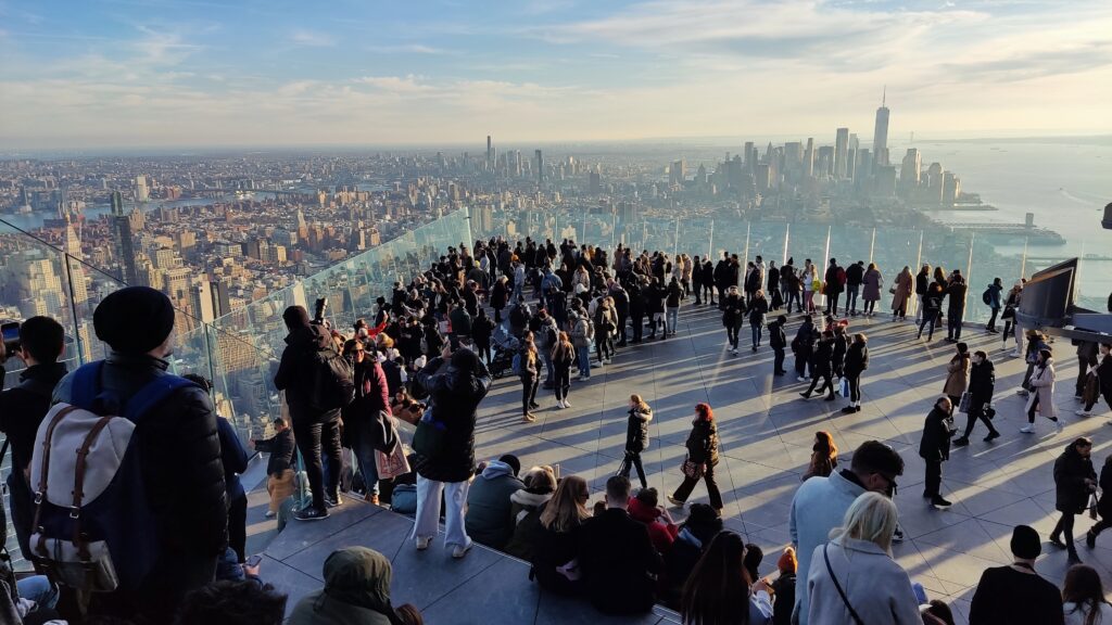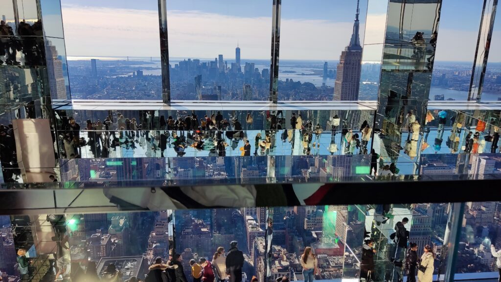 Y llegamos al Edge, otro de los miradores que no nos queríamos perder. Si el día anterior en el Summit nos quedamos maravillados con las vistas, y yo lo rebauticé como «el mirador del postureo» por el juego que dan los ventanales y las vistas para hacerte fotos chulas, este diría que es «el mirador del vértigo». No es apto para personas con vértigo, tiene un mirador que sobresale de la planta 100, y tiene una parte con suelo de cristal, imagina las vistas. Está totalmente acristalado, pero es exterior.