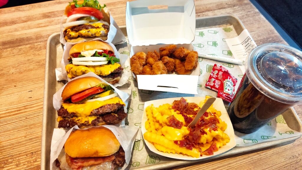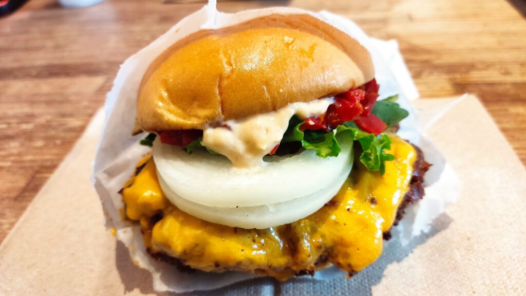 Desde la planta siguiente ves el efecto espejo que deja imágenes curiosas, y las vistas al fondo. Pasamos más de dos horas en este mirador, entre las atracciones y las vistas el tiempo se te pasa volando, y decidimos ir a comer antes de seguir con la ruta. El primer día no podía ser de otra manera, comimos hamburguesas, las típicas hamburguesas americanas, que aunque sean de una franquicia, la carne es superjugosa.
