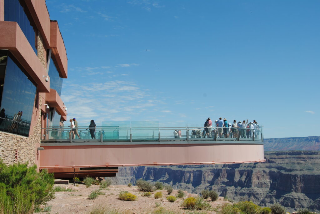 El Skywalk es un mirador artificial, tiene forma de herradura y su suelo de cristal te da una panorámica del cañón a 1.200 metros de altura, te hará sentirte como un águila. Por algo estamos en el «Mirador de las águilas». Esta pasarela está diseñada para soportar 800 personas, pero no dejan pasar a más de 120, así que tranquilo, por exceso de peso, no se va a caer, puedes cenarte una buena hamburguesa la noche antes de visitarlo.